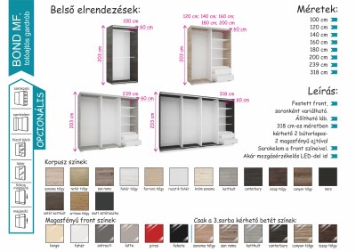 A Bond gardrób széles választékkal igyekszik mindenki igényeinek megfelelni. Számos méret és megannyi bútorlapszín közül választhat. 100, 120, 140, 160, 180, 200, 239 illetve 318 cm-es kivitelben kapható. Belső elrendezést tekintve teljesen személyre szabható, köszönhetően az akár egymásra is helyezhető fiókdobozoknak, polcoknak, mándlirudaknak. Opcionálisan választható termékek: – sarokpolc – tolóajtós sarokelem – fózolt tükör – tükör – fiókos alsó magasító – tolóajtós felső magasító.